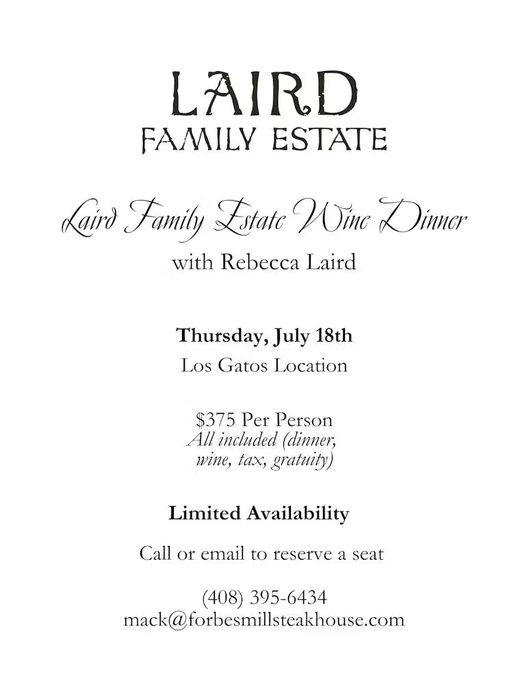 Join us at Forbes Mill Steakhouse in Los Gatos for an exclusive wine dinner featuring Laird Family Estate. Executive Chef Brian Weselby has crafted a special menu to complement the distinctive flavors of Laird's vintages.