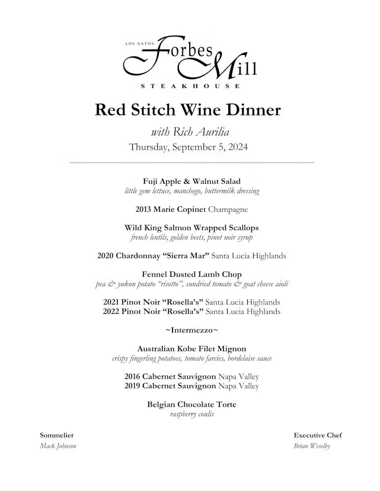 Join us for an exclusive wine dinner featuring Red Stitch, hosted by co-owner and former San Francisco Giant, Rich Aurilia. Our sommelier, Mack Johnson, has carefully selected a range of wines to accompany a thoughtfully prepared five-course meal by Chef Brian, designed to complement each wine.